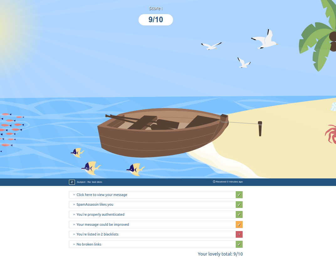 处理完这些,mail-tester终于收到邮件了。当然,得分依然不高。